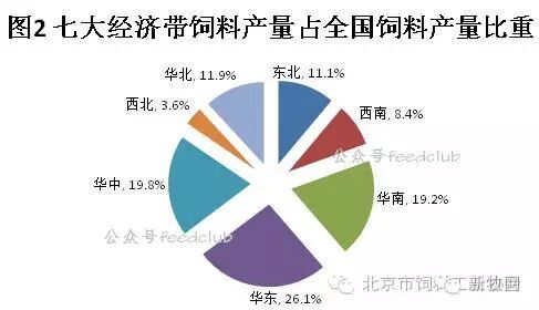 2015年,七大经济带产量,华东地区(上海、江苏、浙江、安徽、福建、山东)饲料产量占全国饲料总产量26.1%,为七大区域之首。其次是华中地区(河南、湖北、湖南、江西)、华南地区(广东、海南、广西)占全国总产量比重分别为19.8%、19.2%(图2)。