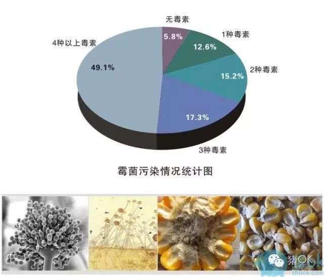 霉菌毒素是一种存在饲料和原料中的抗营养因子,是毒素很强的霉菌次生代谢产物。在饲料的加工、运输和贮存过程中都会产生霉菌毒素,应该说世界上没有一个地方可以躲过霉菌污染的。世界上每次年大约有25%谷物遭受各种霉菌污染,因污染程度不同,不同地区差距很大,中国是霉菌毒素的重灾区。中国动保协会调查统计如图所示,在养殖过程中,经常遇到育肥猪生长速度缓慢、母猪假发情、哺乳仔猪拉稀等。据统计,己知的霉菌毒素有300多种,常见的毒素为以下6种: